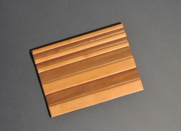 Pannello per borsa «a busta» da giorno in liste di legno bicolore applicate alternativamente su tela nera a creare motivo decorativo.