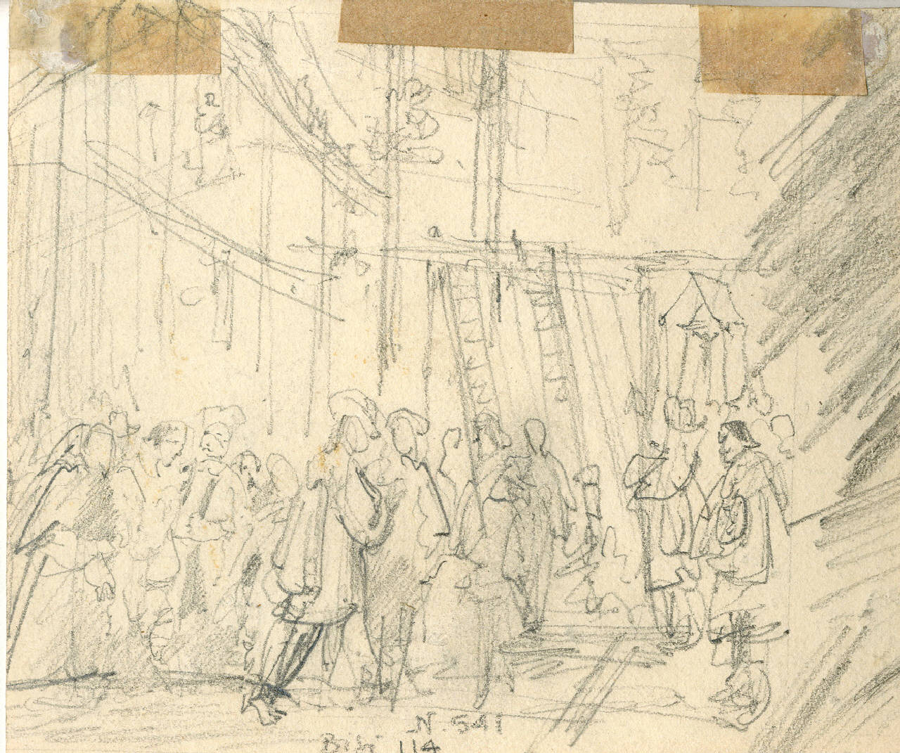 Studio preparatorio di una vignetta dei Promessi Sposi. Sullo Sfondo sono visibili edifici architettonici, mentre in primo piano sono inserite le figure umane.
