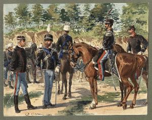 - NOTIZIE STORICO CRITICHE Nel disegno si possono riconoscere tra le truppe in addestramento: in primo piano, da sinistra a destra, un tenente colonnello in uniforme ordinaria, un colonnello comandante del 24° Cavalleggeri di Vicenza in grande uniforme, un ufficiale d'artiglieria di spalle, in uniforme di marcia, un tenente del 5° Lancieri di Aosta in grande uniforme e un sottotenente dello stesso reggimento in uniforme ordinaria.