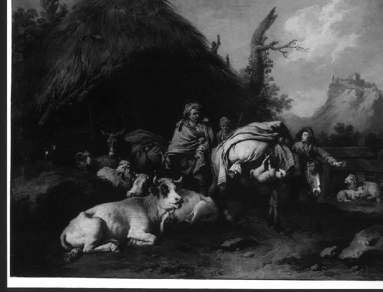 SCENA PASTORALE CON PASTORI E ANIMALI DOMESTICI DAVANTI AD UNA CAPANNA