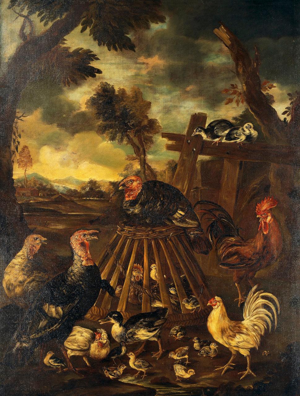 Animali da cortile con gabbione. tacchini, gallo, pulcini