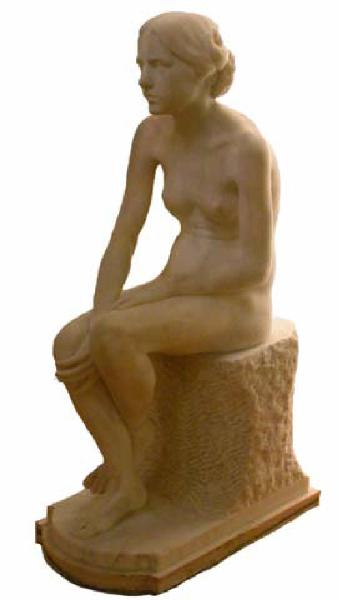 Giovane donna nuda seduta su un sedile di pietra. La donna è rappresentata frontalmente e con le mani sulle gambe.
