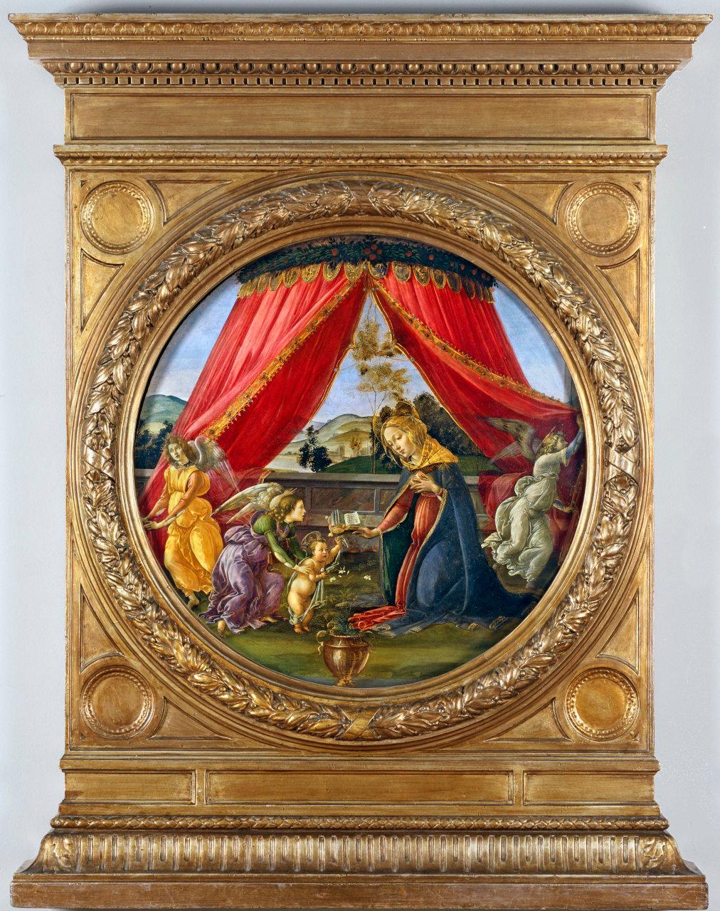 - NOTIZIE STORICO CRITICHE Secondo una guida dell'Ambrosiana del 1837, il dipinto è stato donato dalla marchesa Fiorenza Talenti, probabilmente la nobildonna milanese Lelia Fiorenza Talenti, benefattrice del Collegio Oblati di Rho, deceduta nel 1813. L'attribuzione a Sandro Botticelli, che appare in tutte le pubblicazioni a partire dal 1860, è quasi unanimemente riconosciuta. Per la datazione c'è accordo sull'inizio degli anni novanta del Quattrocento. Il modo di trattare il soggetto non ha precedenti: la scena dal tema convenzionale è trasformata in un'immagine di grande vivacità. Due angeli tirano energicamente le tende di un baldacchino per mostrare un terzo angelo che aiuta il Bambino a muovere i primi passi mentre guarda la Madre che fa sgorgare uno zampillo di latte dal seno. Sullo sfondo un paesaggio che ricorda la valle dell'Arno. L'opera potrebbe essere identificabile con un piccolo tondo ricordato nelle "Vite" del Vasari, del 1568, nella camera del Priore degli Angeli di Firenze Guido di Lorenzo di Antonio. Il tondo è stato oggetto di molteplici interpretazioni iconografiche. I gigli, in un vaso in primo piano, sono interpretati come simboli della città di Firenze; il baldacchino come padiglione celeste, la posa della Madonna come una Vergine annunciata. I risvolti del baldacchino riportano segni di difficile interpretazione nei quali alcuni vedono le iniziali "S", "M", "F" che indicherebbero "Sandro Mariano Fecit". Gli angeli che solevano la tenda trovano riscontro con un disegno degli Uffizi. (Fahy, 2004)