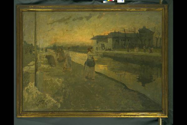 Le lavandaie sul Naviglio. VEDUTA DEL NAVIGLIO CON LAVANDAIE