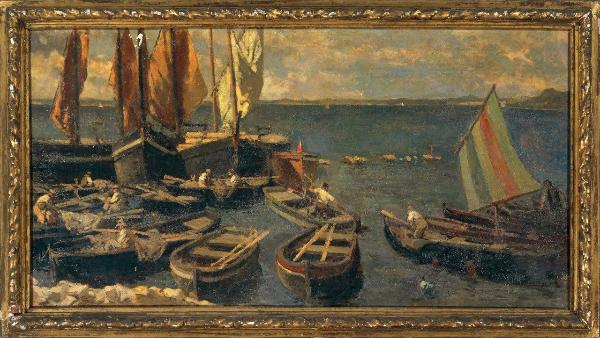 Marina. marina con barche a vela e a remi e pescatori