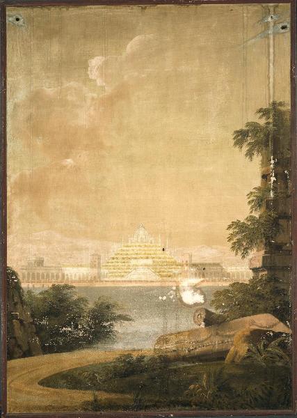 Rovine con veduta dell'Isola Bella. paesaggio invernale con architettura