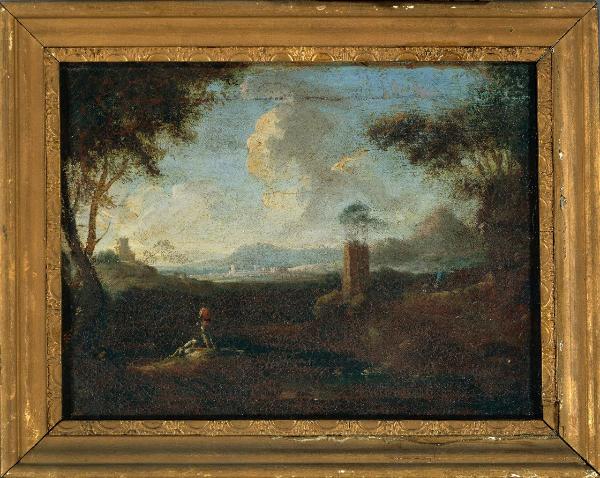 Paesaggio. pianura con ruderi e viandanti