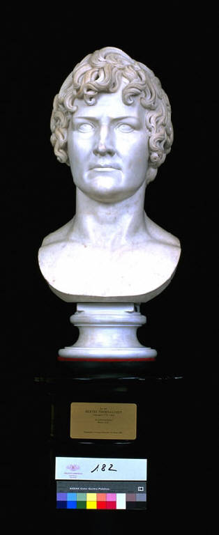 - NOTIZIE STORICO CRITICHE Bertel Thorvaldsen nel 1810 esegue il proprio ritratto in scultura su commissione del pedagogo e collezionista danese Hans West, che intendeva donarlo all'Accademia Reale di Copenaghen. A partire da una serie di disegni, di tre quarti e di profilo, Thorvaldsen modella il proprio volto in chiave eroica, sottolineata dalla forma all'antica dell'erma e dalle dimensioni semicolossali, ma anche dalla tensione morale, dalla forza e gravità dell'espressione. Fedele al dato naturalistico, Thorvaldsen inserisce un puntuale rimando alla scultura classica nella resa della mossa scapigliatura, sul modello di un antico frammento di Policleto. Il busto giunge all'accademia danese nel Palazzo di Charlotteborg solo nel 1824, consegnato in ritardo dall'autore. Il modello in gesso originale risulta perduto. La versione dell'Ambrosiana è variata rispetto alla prima, nella forma circolare del busto. Appartenne al conte Giovanni Antonio de Pecis che la donò nel 1827 insieme alla sua collezione . La testa era stata probabilmente donata dallo stesso Thorvaldsen al De Pecis per il ruolo svolto nella vicenda del monumento Appiani allestito a Brera. Un terzo esemplare appartenuto alla regina Maria Cristina di Sardegna fu venduto da Filiberto di Savoia nel 1949 allo scultore di Lugano Alfredo Cocchi. Esiste un'ulteriore versione di incerta autografia (Grandesso, 2009)