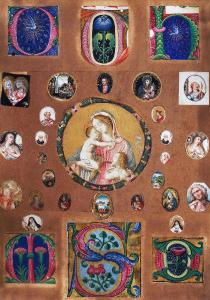 - NOTIZIE STORICO CRITICHE Sono raccolte 31 miniature ritagliate di vario formato. La miniatura più grande è un tondo posto al centro con la Madonna con il Bambino e San Giovannino; vi sono poi 6 iniziali figurate e diversi ovali molto piccoli con raffigurazioni della Vergine, santi e Agnello mistico. Lo stile delle iniziali sembra appartenere alla fine del XV - inizio XVI sec., mentre le piccole figure di santi sono seicentesche e potrebbero provenire da libretti di devozione privata o da medagliette votive.