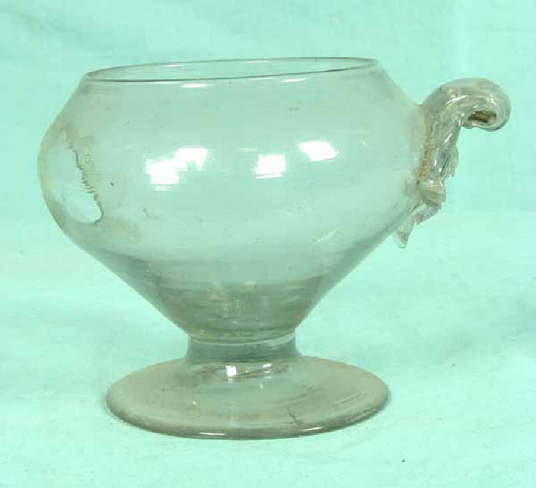Compostiera a corpo sferoidale con un'ansetta a pasticca terminante a ricciolo nella parte superiore, originariamente erano due. Piede a disco applicato. Segno del pontello.\nBibliografia