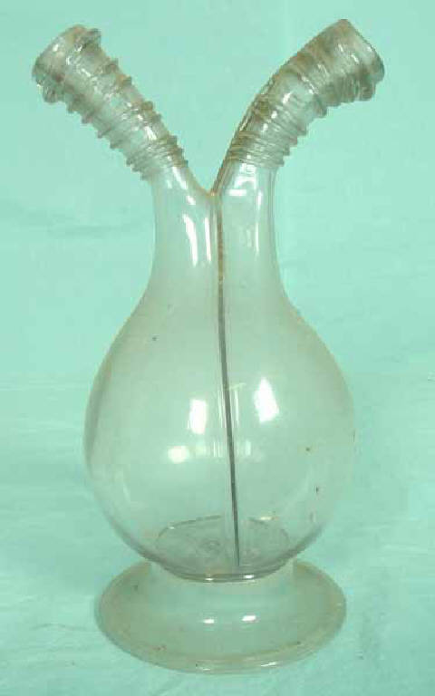 - NOTIZIE STORICO CRITICHE Il procedimento di lavorazione con il quale è stato realizzato il nostro pezzo è molto simile a quello utilizzato per un'ampolla di forma simile, datata agli inizi del XVIII secolo, attribuita a Venezia e conservata nel Museo Bagatti Valsecchi di Milano: nella prima fase il vetraio soffia un'unica ampolla ed applica alla bocca ed eventualmente a metà del vetro un filo vitreo a spirale. Successivamente con lo strumento taglia verticalmente il collo così da ottenere due colli separati e strozza il vetro così da dividerlo in due zone, ciascuna corrispondente a uno dei due colli. Mentre i due colli sono mantenuti in posizione divergente, le due parti del ventre vengono ricompattate schiacciandole, pur mantenendone la separazione. Tracce di questa specifica lavorazione rimangono lungo una linea verticale in corrispondenza del taglio e nel filo avvolto intorno ai colli che risulta sfalsato (BAROVIER MENTASTI, TONINI 2003, p.425).\nLa produzione di ampolle gemine è attestata a partire dal Settecento a Venezia, come documentato da diversi pezzi: uno nel Castello di Rosenborg a Copenaghen, facente parte della collezione di Federico IV di Danimarca, collocabile nel primo decennio del Settecento (BOESEN 1960, n.4), un altro, in vetro girasol, nel Kunstgewerbemuseum di Berlino (DREIER 1989, pp.86-87, n.72) e un terzo nei Musei Civici di Modena (BIETTI, CANOVA, PETTENATI 1993, p.57, n. 23).\nQuesta forma doveva essere già in produzione nella seconda metà del Seicento, poiché è raffigurata in uno dei disegni tratti dalla corrispondenza tra John Green e Alvise Morelli, datata tra 1667 e 1672 (ZECCHIN 1990, p.68). \nLa produzione di ampolle, simili nella forma alla nostra, si ritrova nello stesso periodo in altre aree d'Europa: in Francia, in Normandia, la cui produzione è documentata da un pezzo conservato al Louvre, di 10 centimentri più piccolo, datato alla metà del XVIII secolo (BELLANGER 1988, p.381; NEWMAN 1993 p.128), decorato con il motivo a fili avvolti, che compaiono anche su un'altra ampolla gemina, conservata nelle Kunstsammlungen der Veste Coburg (THEUERKAUFF LIEDERWALD 1994, p.471, n.563); un altro, attribuito alla façon de Venise, è comparso ad un'asta di Christies (An important¿2000, p.78, n.182); un terzo esemplare di produzione toscana è stato datato al XVIII secolo (LAGHI 1994, p. 88). Ampolle gemine, con fili avvolti erano prodotte anche ad Altare nell'Ottocento (MALANDRA 1983, fig.191) e forse a tale area sono da attribuire alcuni pezzi conservati nel Castello di Issogne, facenti parte del corredo vetrario, allestito nella Sala da pranzo, datati all'ultimo ventennio del XIX secolo (SOFFIANTINO 2000, figg.-11). Un'altra ampola molto simile ricoperta da un motivo in paglia, datata presumibilmente al XIX secolo, è conservata nel Museo Ariana di Ginevra (BAUMGARTEN 1995 a p.80, n.107).\nPer la nostra ampolla si può forse proporre una datazione all'Ottocento sia per il colore del vetro sia per la fattura, anche se questa datazione non è completamente certa.