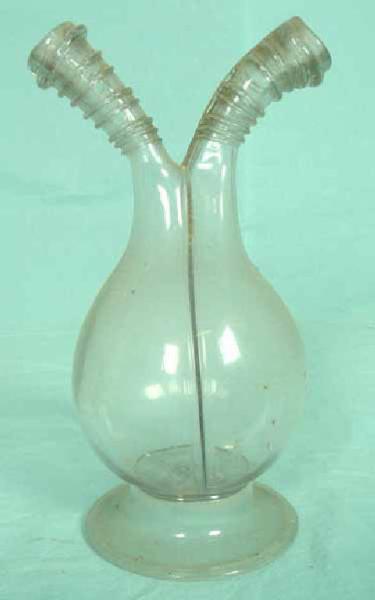 Ampolla gemina, composta da due elementi a forma di bulbo leggermente schiacciati e uniti tra di loro, terminanti con due colli ricurvi decorati da fili vitrei avvolti. Base poco rilevata con bordo ripiegato nella parte interna.Segno del pontello.