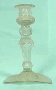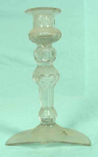 Candeliere con stelo formato da un elemento cilindrico che si allarga a metà circa, sormontato da due nodi molati con motivi a forma di esagono sui quali si innesta il corpo ottagonale per l'alloggiamento della candela, anch'esso molato con motivi geometrici e con imboccatura di nove lati. Piede a disco con molature a cerchi nella parte interna. Segno del pontello