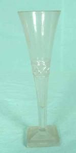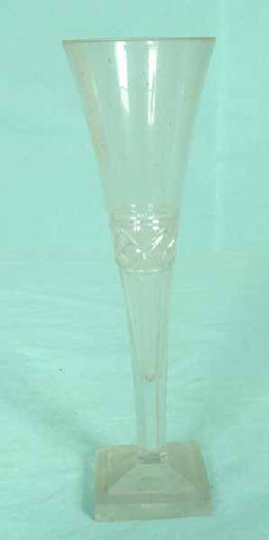 • NOTIZIE STORICO CRITICHE Calici, con coppe di diversa forma, tra le quali anche quella a flute, incisi con motivi floreali, dai lunghi steli molati e dai piedi quadrati, sono documentati nella produzione boema del primo quarto dell'Ottocento e sono conservati nel Passauer Glassmuseum (Das Böhmische¿ 1995, vol.II, p.205, n.305). I motivi decorativi, ottenuti con la molatura, che compaiono nella fascia centrale del nostro pezzo ricorrono in diversi vetri d'area boema, a partire dal 1825 circa fino al 1850 circa, come evidenziato da alcuni pezzi conservati sempre nel Passauer Glassmuseum (Das Böhmische¿ 1995, II, p.70, n. 87, p. 94, n.119, p.95, n.121).