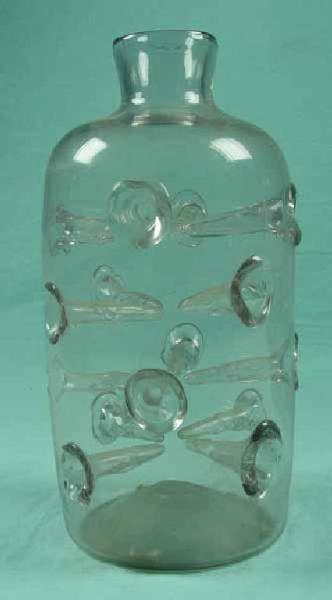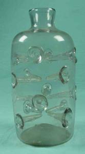 Bottiglia di forma cilindrica con cunei vitrei inseriti su tutta la superficie del corpo; corto collo cilindrico. Segno del pontello