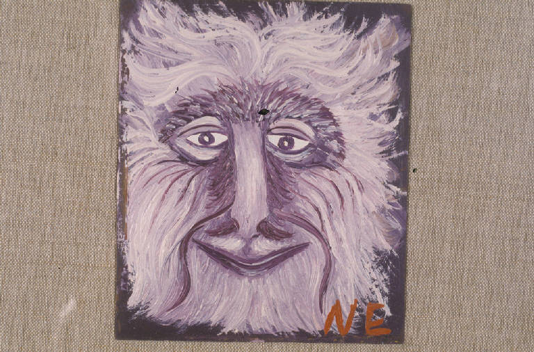 Piccolo dipinto raffigurante la testa di un animale fantastico di colore grigio-bianco, con occhi benevoli e sorriso