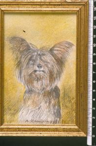 - NOTIZIE STORICO CRITICHE Il piccolo dipinto ritrae "Pepe", il cane di proprietà di Angela Candiani. Nella collezione Lajolo esiste un altro dipinto con le stesse dimensioni e lo stesso soggetto.\nConsiderato che la Candiani e la Ramponi erano legate da un rapporto d'amicizia, è probabile che la Candiani abbia chiesto all'artista di farle un ritratto del suo affezionato cane, oppure che la Ramponi stessa abbia avuto questo pensiero nei confronti dell'amica.\nL'attenzione per il mondo della natura rientra comunque nelle tematiche dell'artista.\nIl dipinto si colloca ovviamente al di fuori della produzione nota della Ramponi e risulta difficile stabilire una datazione precisa.