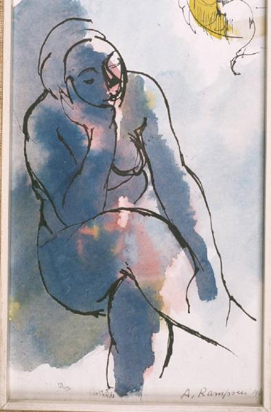 - NOTIZIE STORICO CRITICHE Il soggetto di questo acquerello, una figura di donna in atteggiamento meditativo e malinconico, è significativo della fase di passaggio dal periodo realista a quello in cui la Ramponi si sposta su tematiche di carattere più intimista e personale. Siamo dunque, come conferma anche la data, a cavallo tra il decennio degli anni '60 e quello degli anni '70. \nE' sempre in questo periodo poi, che tra i soggetti privilegiati della Ramponi compare il paesaggio notturno con la luna (De Micheli 1974), che fa compagnia anche alla donna di questo dipinto.