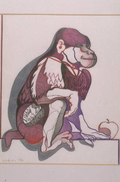 - NOTIZIE STORICO CRITICHE Il soggetto degli animali compare frequentemente sia nella scultura che nella grafica di Floriano Bodini. \nLa scimmia in particolare compare anche nel noto gruppo scultoreo "Biografia inquieta di un personaggio femminile" (1976), in cui, tra i diversi elementi che concorrono a comporre il ritratto della moglie Wanda, l'animale simboleggia la tenerezza.\nA questo proposito scrive Lajolo in una lettera che fa da presentazione a una mostra dell'amico nel 1975: "Nel tuo studio c'era Amedeo, il cane color moscato, che dormiva sulla poltrona dietro l'ampio tavolo ma ti guardava con i grandi occhi inteneriti (...). Per questo bestiario reale come Amedeo io ti ho chiesto entrando e vedendo tanti animali che fanno corpo con l'uomo e con la figura se eri un lettore di Umberto Saba. Mentre passavo davanti e toccavo le tue bestie mi erano venuti in mente i versi del poeta: (...) "In una capra dal viso semita - sentivo querelarsi ogni altro male - ogni altra vita"." (Lajolo 1975).\nGiorgio Seveso commenta così gli animali realizzati dall'artista: "Sintesi inquieta, assorta, trepidante tra il regno della natura e quello della tecnologia nella meccanicità, appunto, delle più calde emozioni organiche, nella sanguigna, "razionale" animalità tecnomorfica del gesto figurale. Contrasto fecondo, intreccio mobile di mondi e visioni diverse che si saldano nella sonora consistenza del metallo e nell'incisa asciuttezza del disegno (...)" (Seveso 1979).\nIl brano è estratto dal testo critico di Seveso pubblicato sul catalogo della mostra "gli uomini / gli animali", tenutasi nel 1979 alla galleria Spazio Immagine di Milano, in cui erano esposte una decina di sculture, sei disegni e trenta lavori di grafica dedicati in buona parte al tema degli animali. \nTra le sculture esposte c'è anche "La scimmia", del 1977, molto vicina dunque come realizzazione al disegno della collezione Lajolo.\nSi potrebbe ipotizzare che il disegno sia uno studio per la scultura, se non fosse che l'artista stesso, intervistato nel 1976 da Anty Pansera per la rivista "Artecontro", afferma di non avere l'abitudine di realizzare studi per scultura e di considerare il disegno una mezzo espressivo indipendente (Bodini, 1976).\nLa produzione grafica dell'artista gode dunque di una sua autonomia e riveste un ruolo tutt'altro che marginale all'interno dell'attività di Bodini, il quale si è molto dedicato alla realizzazione di incisioni, per la prima volta raccolte e pubblicate in un volume nel 1973 (Fabiani 1973).