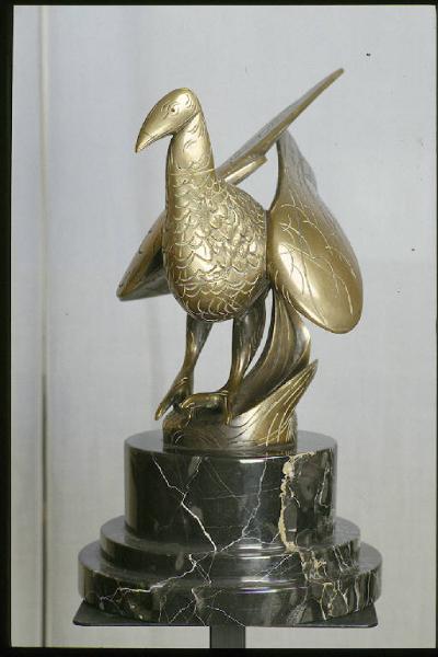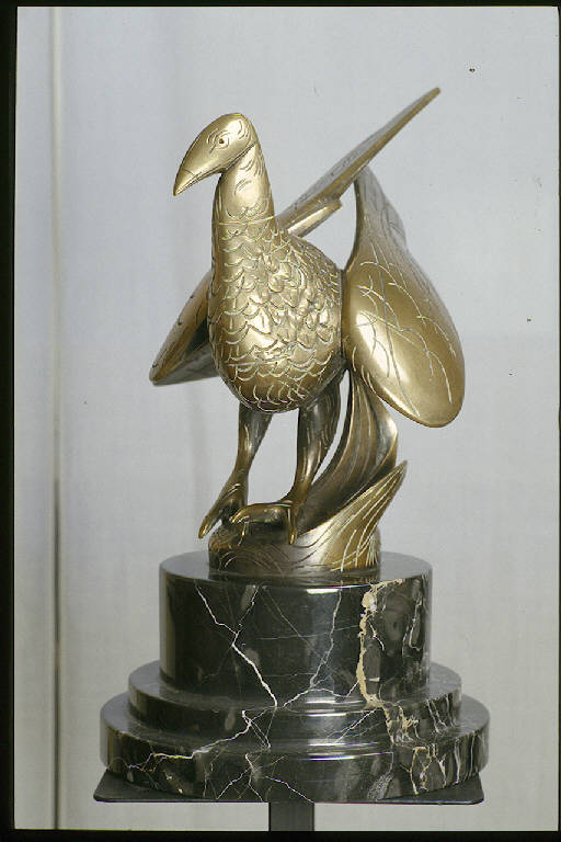 Colomba con ali e coda scostati dal corpo, come se si stesse alzando in volo o si fosse appenna appoggiata al suolo; superficie incisa con solchi a indicare il piumaggio