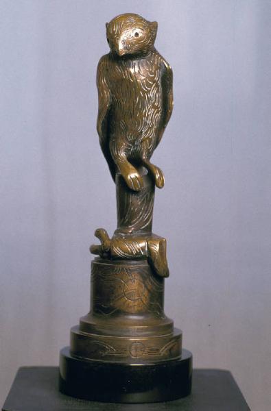 - NOTIZIE STORICO CRITICHE Il soggetto degli animali compare frequentemente sia nella scultura che nella grafica di Floriano Bodini. \nA questo proposito scrive Lajolo in una lettera che fa da presentazione a una mostra dell'amico nel 1975: "Nel tuo studio c'era Amedeo, il cane color moscato, che dormiva sulla poltrona dietro l'ampio tavolo ma ti guardava con i grandi occhi inteneriti (...). Per questo bestiario reale come Amedeo io ti ho chiesto entrando e vedendo tanti animali che fanno corpo con l'uomo e con la figura se eri un lettore di Umberto Saba. Mentre passavo davanti e toccavo le tue bestie mi erano venuti in mente i versi del poeta: (...) "In una capra dal viso semita - sentivo querelarsi ogni altro male - ogni altra vita"." (Lajolo, 1975).\nGiorgio Seveso commenta così gli animali realizzati dall'artista: "Sintesi inquieta, assorta, trepidante tra il regno della natura e quello della tecnologia nella meccanicità, appunto, delle più calde emozioni organiche, nella sanguigna, "razionale" animalità tecnomorfica del gesto figurale. Contrasto fecondo, intreccio mobile di mondi e visioni diverse che si saldano nella sonora consistenza del metallo e nell'incisa asciuttezza del disegno (...)" (Seveso,1979).\nIl brano è estratto dal testo critico di Seveso pubblicato sul catalogo della mostra "gli uomini / gli animali", tenutasi nel 1979 alla galleria Spazio Immagine di Milano, comprendente una decina di sculture, sei disegni e trenta lavori di grafica dedicati in buona parte al tema degli animali. \nTra le sculture esposte c'è anche una "civetta" del 1978, diversa da questa della collezione Lajolo, più naturalistica e meno geometrizzante.\nCome indicato dall'iscrizione sul bronzo (?), la scultura della collezione Lajolo non è un esemplare unico.\nUna copia della stessa opera è riprodotta sul catalogo di una mostra di Bodini del 1991 (Corradini, 1994). \nNell'esemplare di questo catalogo posseduto dalla Fondazione Lajolo, sulla pagina che riproduce la scultura Angela Candiani aveva messo un contrassegno. A quella data la "civetta" o era già in suo possesso dal 1989, data di esecuzione dell'opera, o era stata da lei notata per l'acquisto. \nLa scultura infatti, come la maggior parte delle sculture di Bodini presenti nella collezione, è un acquisto fatto dalla Candiani nel periodo successivo alla morte del marito (1984) (2000, comunicazione orale).