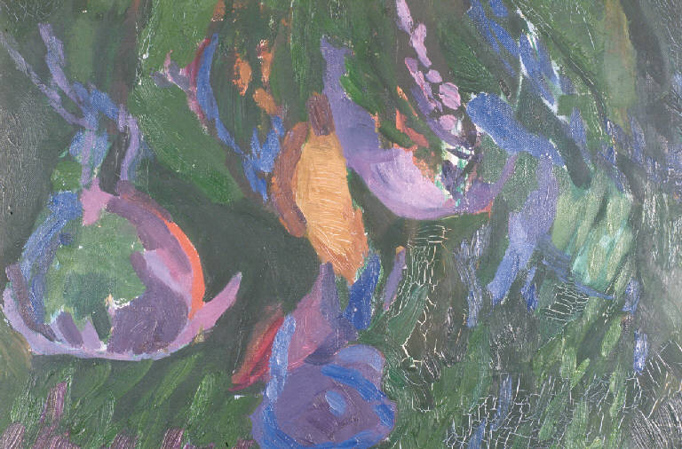 - NOTIZIE STORICO CRITICHE Dall'etichetta della Galleria Il Triangolo, di Busto Arsizio, applicata sul retro, si apprende che l'opera è stata esposta alla mostra personale di Maffi tenutasi nello stesso anno in cui il quadro fu eseguito, il 1973. Il dipinto è segnalato come appartenente alla collezione della "Sig. ra Angela" (Angela Candiani).\nEsso raffigura la vegetazione fiorita delle rive dell'Adda, eseguita in stile informale e gestuale. \nCon la fine degli anni '60, Maffi comincia infatti a raffigurare in maniera nuova il paesaggio della sua terra lodigiana, avulso ora da tematiche letterarie e non più "abitato" dalle storie contadine che lo avevano precedentemente caratterizzato. Le rive dell'Adda divengono protagoniste della sua pittura, popolate o meno da presenze umane, animali, o anche non reali, provenienti dal passato e dal mondo dei ricordi. \nScrive Carlo Munari: "(...) Maffi si confronta con la natura, specchio in cui il presente fuggevole si assorbe nell'abisso del passato, desumendone orme labili, tracce di trascorse esistenze, segni di eventi sospesi nel flusso implacabile degli anni, per ricondurli nel cerchio della propria esperienza, riconoscendoli agenti condizionatori del suo destino. Infine, nell'esigenza di approfondire ulteriormente quella immagine, e di decantarla all'estremo, su questa linea l'artista doveva accostarsi alla sfera dell'organico ed inquisirla sino a reperire tensioni e pulsioni che, per relazione analogica, riflettessero la dinamica della sua stessa interiorità." (Munari, 1980).