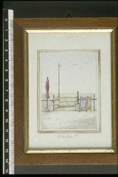 Tratto di lungomare con ombrellone chiuso e sedie a sdraio piegate e appoggiate a balaustra sul mare; intorno al paesaggio è disegnata anche una finta cornice