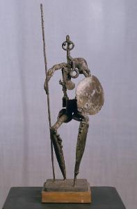 - NOTIZIE STORICO CRITICHE Questo guerriero è un chiaro esempio della prima produzione scultorea di Vicentini, inaugurata dall'artista nel 1967 circa dopo anni di attività come pittore. Manifestando una consonanza poetica con il contemporaneo movimento del Nouveaux Realisme, egli subisce il fascino degli oggetti di uso comune che recano le tracce del tempo e li assume come principale materia prima e fonte di ispirazione, realizzando assemblamenti, in una compagine figurale, di "objets trouvés" quali vecchie chiavi, viti, chiodi. \nL'attenzione verso quanto è oggetto di usura e di oblio, che sicuramente gli deriva in parte dal mestiere di restauratore svolto per molti anni, segna anche la produzione scultorea successiva al 1970, che, seppur notevolmente diversa, mette sempre in evidenza la stratificazione del tempo sulle cose del quotidiano, in questa fase ricreata artificialmente con l'utilizzo di tecniche miste che conducono a risultati di un forte iperrealismo.\nCome scrive Rossana Bossaglia, il tema principale dell'opera di Vicentini "scultorea o pittorica che sia - sempre che queste definizioni siano valide a rappresentare le sue tecniche e i suoi modi espressivi - " è quello della parvenza, "dell'impossibilità, per le cose e per gli eventi, di darsi come presenza diretta, facendosi essi presenza soltanto attraverso la memoria." (Bossaglia, 1987).
