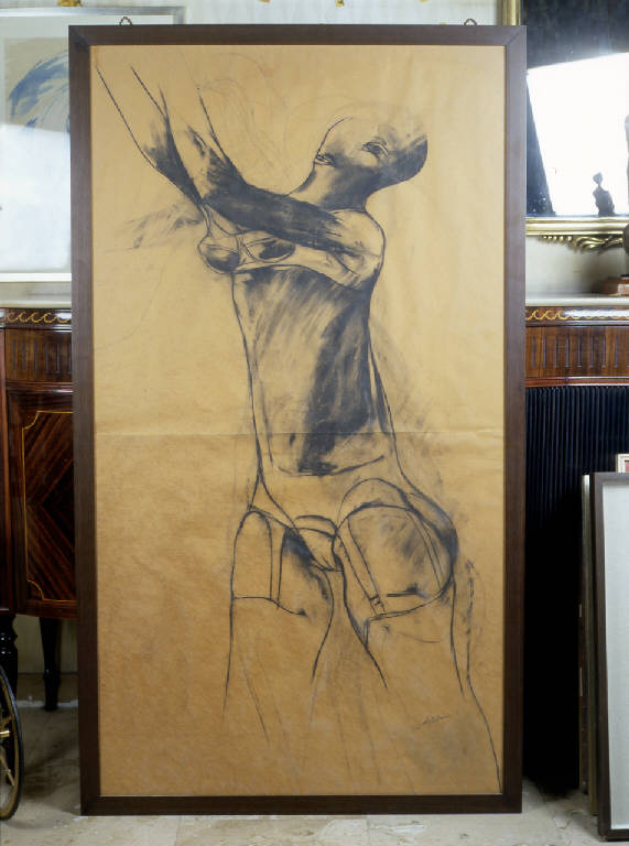 - NOTIZIE STORICO CRITICHE Nonostante il soggetto del nudo femminile non rientri tra quelli più ricorrenti e conosciuti della pittura di Dova, esso è invece abbastanza frequente nella sua produzione grafica. \nCon tale soggetto è noto un gruppo di grandi carboncini su carta realizzati tra il 1957 e il 1958, simili al nostro disegno che non è datato (Russoli, 1975). Una maggiore mordidezza delle forme e del tratto, ottenuta anche tramite profondi sfumati che "sporcano" la carta, contraddistingue tuttavia il disegno di proprietà della fondazione.\nIl soggetto e lo stile di questa serie di nudi sono in linea con la ricerca che Dova intraprende in quel giro d'anni, caratterizzata dallo spostamento dalla precedente sperimentazione astratta e da un "mondo imprigionato negli incastri di smalti e vetrate" (come scrive Russoli) verso una maggiore naturalezza di corpi ed ambienti, con più attenzione nei confronti della rappresentazione di problemi esistenziali, male di vivere, perdita della libertà, reificazione dei valori etici.\nE' forse proprio a quel gruppo di disegni che si riferisce Davide Lajolo in un articolo del 1972 dedicato a Dova: parlando di un incontro con il lavoro dell'amico avvenuto nel periodo precedente ai soggiorni dell'artista in Bretagna (primi anni '70), lo scrittore ricorda di aver visto "grandi disegni di donne con i volti, i seni, le cosce che spuntavano da ogni dove." (Lajolo, 1972).\nNell'articolo Lajolo cita però anche una più recente mostra di nudi e pastelli di Dova tenutasi alla Galleria d'arte Borgogna di Milano in un momento vicino all'antologica dell'artista a Palazzo Reale (1972). I pastelli presentati in quell'occasione sono quasi certamente gli stessi che vengono pubblicati nel volume "Quale figura" (Fagone, 1973): si tratta di un gruppo di carboncini di grandi dimensioni (149 x 99) realizzati nel 1971.\nL'esecuzione del disegno in questione potrebbe dunque collocarsi in un periodo che va dalla fine degli anni '50 ai primissimi anni '70.\nI nudi di donna realizzati da Dova, pur rappresentando, come già ricordato, una parte non così conosciuta della produzione dell'artista, sono ben presenti nella memoria di Lajolo. Egli ne fa cenno anche in un articolo del 1975, laddove parla di quella componente razionale che impedisce all'artista il decollo al sentimento anche quando "s'intenerisce nelle ombre cocenti dei suoi nudi di donna - la rivolta del cuore - (...)" (Lajolo, 1975).\nL'attenzione di Lajolo verso questo tipo di soggetti è coerente con il suo gusto e le sue preferenze. Non sorprende che due dei tre disegni di Dova che la collezione Lajolo possiede rappresentino proprio questi nudi femminili che, seppur trasfigurati nel linguaggio surrealista dell'artista, sono rappresentati in modo quasi naturalistico e con un forte accento sull'espressione di stati psicologici. Infatti, pur apprezzando la pittura astratta dell'amico, Lajolo resterà affezionato ai suoi primi modi espressivi, di tipo picassiano e legati ai temi della Guerra e della Resistenza.