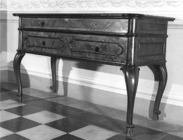 Cassettone a due cassetti di massello di noce, l'inferiore è più grande, ornato con specchiature mistilinee in rilievo e dipinte di nero, piano d'appoggio aggettante decorato con bordo di radica, pomoli d'ottone, poggiante su gambe arcuate terminanti a zoccolo caprino con ricciolo.