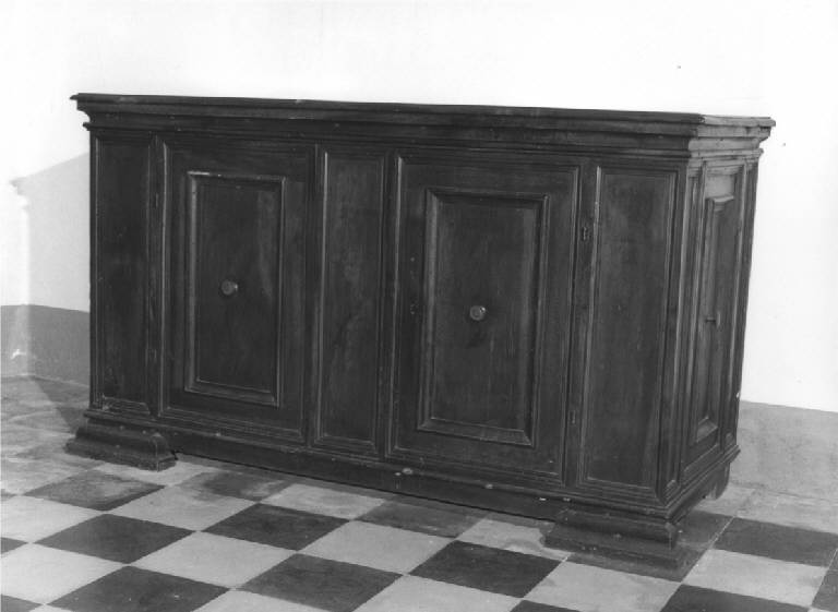 Credenza di massello di noce scurito, due sportelli con semplice specchiature in rilievo alternate a lesene scanalate con capitello schiacciato, pomolo di legno intagliato.
