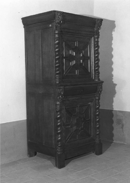- NOTIZIE STORICO CRITICHE L'armadio insolito e raro in Italia è arredo realizzato da erboristeria dei Paesi Bassi del sud nel terzo quarto del secolo XVII, tipiche: la struttura massiccia a due corpi, le caratteristiche specchiature a stella raggiata in rilievo, fiancheggiate da colonne tortili, le teste leonine recanti nelle fauci anelli di bronzo. In genere gli esemplari conservati sono di struttura massiccia, a quattro ante con grandi piedi a sfera ( cfr. quelli conservati nei Musei Vleeshnis e Rubenshnis di Anversa ). Pertanto si può affermare che questo armadio sia stato diviso in tempi successivi, tesi confermata dalla presenza di fianchi di rovere. Un armadio quasi identico a questo, realizzato con gli stessi motivi ornamentali e con il medesimo materiale è conservato nel Museo Platin Moretus di Anversa. Cfr. inoltre un armadio della collezione del Conte de Bronqueville ( Poste, 1932, tav. CVIII )