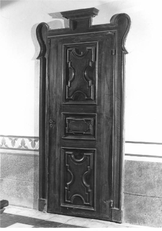 Porta di massello di noce colore naturale, a un battente, decorata con tre specchiature, più piccola la centrale, con formelle mistilinee intagliate, poste entro cornicette in rilievo, stipite ligneo ornato nella parte superiore con mensola centrale a due volute.