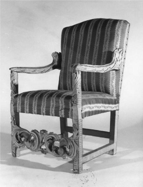 - NOTIZIE STORICO CRITICHE Gli arredi, sono realizzati con esuberante fattura nel sec. XVII probabilmente da bottega lombardo veneta. I motivi decorativi comuni negli arredi veneziani coevi, cfr. la grande poltrona del Museo civico Comer di Venezia ( Morazzoni 1958, tav. XXI ) appaiono qui più moderati nel movimento molto trattenuto e pacato dei braccioli, così come l'ampiezza dello schienale, le traverse e gambe squadrate, la decorazione ad ampio fogliame e il sedile imbottito di stoffa, fanno propendere più all'esecuzione di un'artista lombardo-veneto. Artefice di gusto provinciale, ma che trae ispirazione ed interpreta lo stile imposto nelle numerose opere dei celebri intagliatori Fantoni, soprattutto di Andrea Rovetta ( BG ) che concepirono sempre l'intaglio con un carattere di naturalismo più spontaneo, rispetto ai coevi modelli veneziani ( cfr. le poltrone di Andrea Brustolon tra cui la serie Venier di Cà Rezzonico di Venezia ). Per confronti stilistici soprattutto per i motivi decorativi e per l'intaglio dei seggioloni della raccolta ( ridipinti probabilmente nel sec. XIX per adattarli all'arredamento circostante ) si veda il seggiolone certo di fattura più "nobile" di Anfrea Fantoni conservato nella basilica di Clusone ( BG ), ( AA. VV. I Fantoni, 1978, p. 193 ) e quelli coevi della Civica Raccolta del Castello Sforzesco di Milano ( Rosa 1963 pp., 72-75 ) attribuiti all'Italia settentrionale e alla Lombardia del sec. XVII