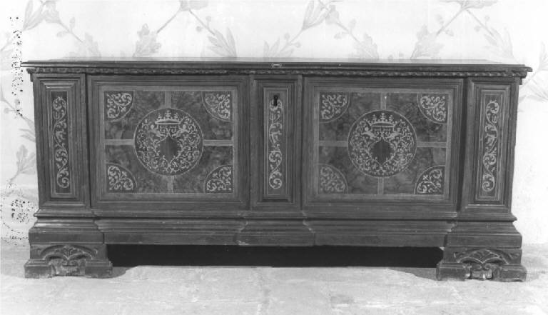 Cassone di massello di noce, radica e pero intarsiati, facciata decorata con due specchiature rettangolari poste entro cornici modanate, decorate con tondo centrale a racemi e corona, i primi ripresi agli angoli della specchiatura e sulle tre lesene, semplice toppa su quella centrale, piano liscio con semplice motivo a dentelli eseguiti a sgorbio sul bordo inferiore, pesante fascia di basamento modanata a linea spezzata, doppi sostegni a mensola intagliati con motivo di volute affrontate, fianchi lisci.