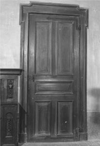 Semplice porta di massello di noce colore naturale lucidato, decorata con cinque semplici formelle per lato, di diversa dimensione, la centrale in posizione orizzontale, poste entro cornicette rilevate e decorate con specchiature in leggero rilievo, stipite coevo di massello di noce sagomato nella parte superiore, rinforzata con parti di ferro, cardini e serrature coevi (qualcuna lacunosa).