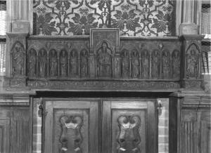 - NOTIZIE STORICO CRITICHE Il rilievo di stile neogotico è stato realizzato con struttura pesante, intaglio rozzo e grossolano, decorazioni fiacche, probabilmente all'inizio del sec. XX da bottega lombarda forse locale con gli armadi andati distrutti nell'incendio del luglio 1911