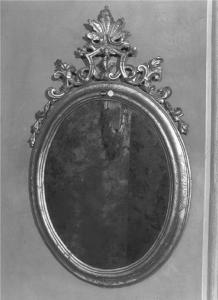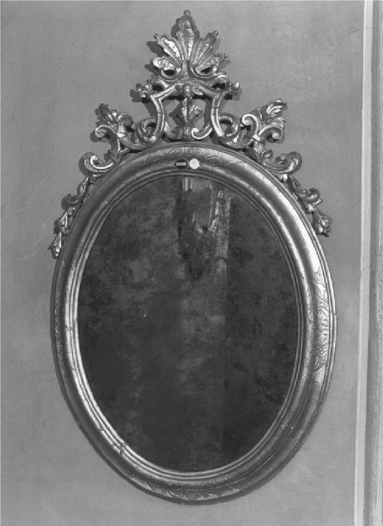 Specchiera di forma ovale con larga cornice modanata di legno dolce inciso con quattro motivi ornamentali, sormontato da leggero fastigio a giorno con foglie, volute e ornamenti, specchio coevo.