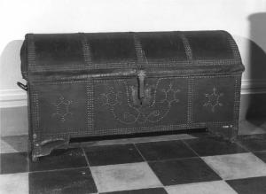 Cassone a baule di marocchino nero su struttura lignea, decorato con disegni a volute e con triplice bordo formato da bulloncini di metallo (doratura probabilmente scomparsa), grande serratura a incastro e toppa di ferro battuto come le due maniglie sui lati con marocchino staccato, parte interna rivestita di tessuto rosato a nastri verdi (non pertinente e rovinato).