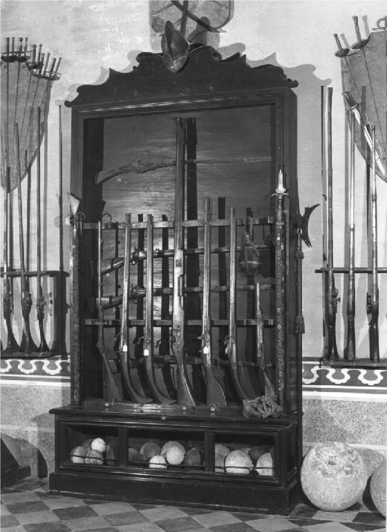 Vetrina a giorno, di massello di noce scurito e lucidato, base rettangolare con tre specchiature aperte su cui poggia una vetrina a giorno per le armi, sormontato da cimasa intagliata.