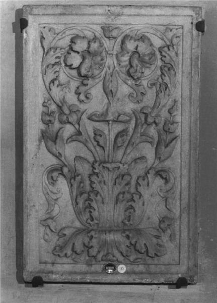Formella raffigurante foglie a calice da cui escono racemi con fiori, fondo liscio, doppia cornice in rilievo
