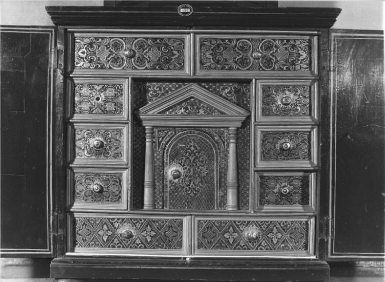Scrigno mobile rettangolare di legno dolce dipinto di nero, con ornamenti dorati, due sportelli lisci, nella parte interna dieci cassettini: quattro di maggiori dimensioni, al centro nicchia con timpano e due colonne decorate con motivi ornamentali dorati, entro cornici modanate dorate, poggiante su piedi a cipolla dorati
