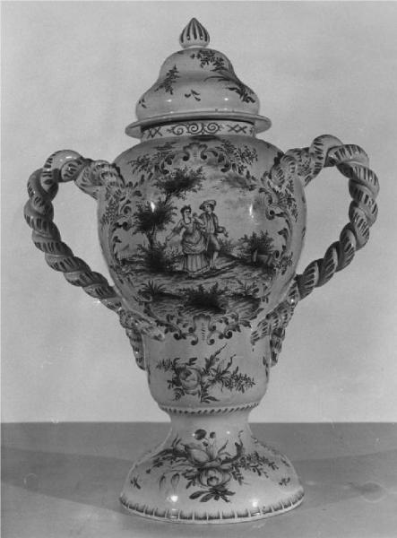 - NOTIZIE STORICO CRITICHE I vasi, di grandi dimensioni e di forma insolita, sono decorati a terzo fuoco con motivi ornamentali piuttosto grossolani e leziosi: scene lacustri vagamente olandesi o scene galanti. Mentre i mazzi di fiori sparsi sono eseguiti con abilità e cura dei dettagli e rivelano l'ispirazione per la forma dei vasi e per la scelta delle decorazioni agli esemplari lombardi ( Milano e Lodi ) della seconda metà del sec. XVIII, oltre a quelli coevi liguri a loro volta di derivazione francese. Per confronti stilistici si veda Levy 1964 tav. 143 e catalogo mostra di Milano 1964 n. 340