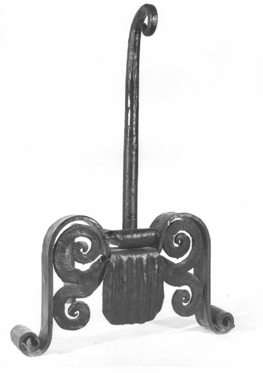 Alari in ferro battuto, con terminale ornato con girali a volute schiacciate e specchiatura centrale a scanalature.