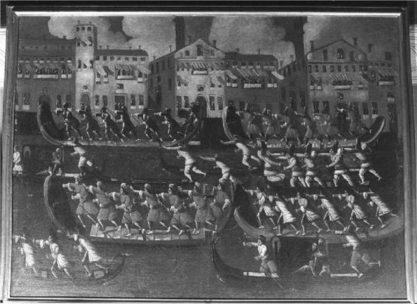 - NOTIZIE STORICO CRITICHE Fa parte di una serie di sei dipinti coevi e stilisticamente molto simili. Questo dipinto si rifà alla famosa gara tra imbarcazioni di varia forma e misura vogate da uno a più vogatori sul percorso compreso tra la Rotta di S. Antonio per arrivare attraverso il Canale Grande a S. Chiara con ritorno "alla macchina" cioè al palco monumentale che s'innalzava di consueto all'imbocco del Rio di Cà Foscari, in volta di Canal, dove venivano consegnati i premi ai vincitori ( Lorenzetti 1937, p. 15 )