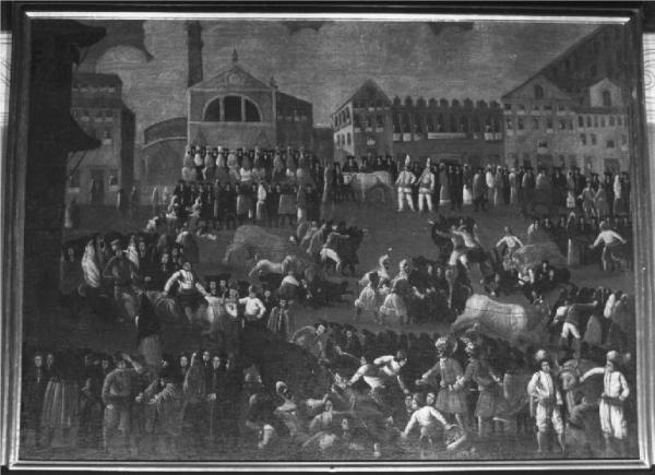 - NOTIZIE STORICO CRITICHE Fa parte di una serie di sei dipinti coevi e stilisticamente molto simili. Questo rappresenta una delle più caratteristiche feste popolari veneziane: la caccia al toro che ricorreva prima del "giovedì grasso" nel cortile di Palazzo Ducale o nella Piazzetta. Sembra inoltre che tale festa dovesse ricollegarsi alla vittoria del 1164 del Doge Vitale Michiel II riportata sul Patriarca Ulrico e sui dodici canonici di Aquileia e il conseguente impegno, di questi prigionieri, di mandare a Venezia dodici maiali con dodici pani grossi e un toro ogni anno, animali che venivano uccisi tra grandi feste e baldorie. Ma questa caccia ricorreva in occasioni straordinarie anche in Piazza San Marco, e più frequentemente in campo S. Paolo, S. Geremia, S.M. Formosa dove pacifici giovenchi legati con corde, venivano assaliti e uccisi da mastini ( Lorenzetti 1937, p. 15 )