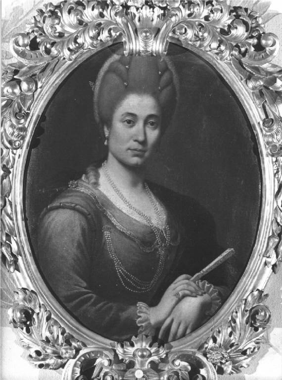 Il dipinto ovale raffigura una dama di tre quarti, in età matura, con veste rosata e manto verde scuro (?), ornata da triplice filo di piccole perle trattenute sul petto da un fermaglio, probabilmente con lo stemma, alle orecchie orecchini con perle a goccia, sul capo una parrucca grigia adorna di piccoli spilloni preziosi, nella mano destra un piccolo ventaglio chiuso, fondo scuro.