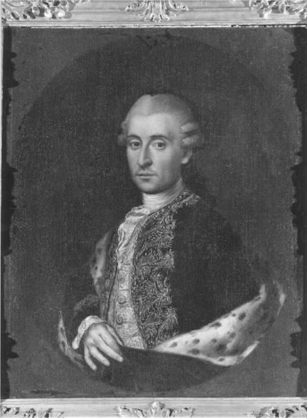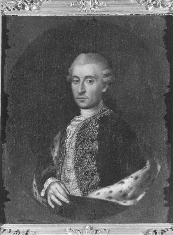 Il personaggio in età matura, con semplice parrucca è raffigurato di tre quarti con marsina ricamata come la sottoveste col braccio destro sorregge il manto d'ermellino, fondo ovale scuro, posto entro cornice di legno dorato.