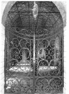 Cancello di ferro, a due battenti, ad andamento mistilineo e con decorazione simmetrica, ornata con volute a girali, serramenti e serrature legate originali.