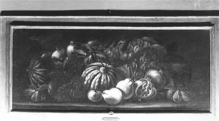 Sono raffigurati appogiati a un tavolo: grosse zucche, grappoli d'uva, limoni, di cui uno tagliato, melograni, prugne e mandorle, cornice di legno dorato